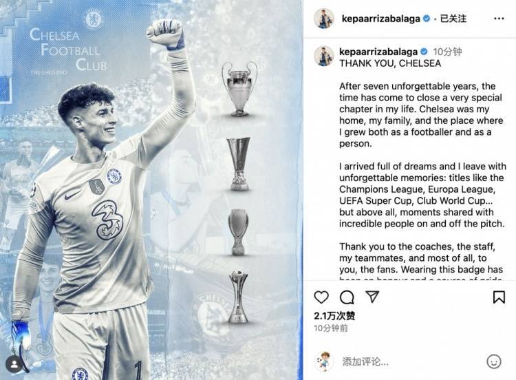 凯帕社媒深情告别切尔西:七年蓝桥时光,当我离开时心中满是感恩